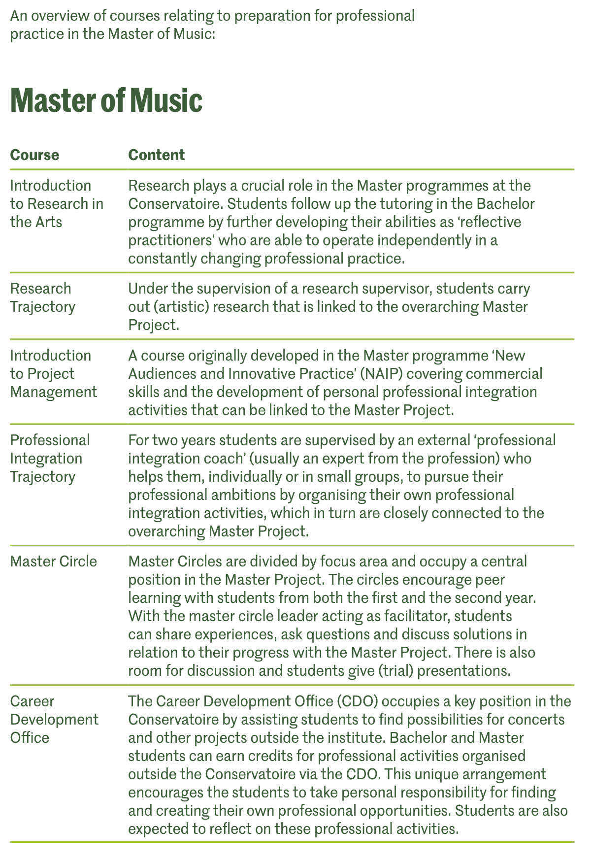 Het Master of Music curriculum omvat drie domeinen: Artistieke ontwikkeling, onderzoek en professionele integratie. Naast het bevorderen van hun persoonlijke artistieke ontwikkeling (in de instrumentale/vocale/compositie lessen) en het doen van onderzoek onder begeleiding van een onderzoeksbegeleider, werken studenten ook samen met een professionele integratie coach in het nastreven van professionele activiteiten. Het middel hiervoor is een Masterproject, waarin studenten de mogelijkheid krijgen om een eigen project te creëren waarin artistieke ontwikkeling, onderzoek en professionele integratieactiviteiten worden gecombineerd. Dit is onze manier om studenten de kans te geven te experimenteren met het ontwikkelen van een persoonlijke beroepspraktijk tijdens hun studie. Zo kunnen de studenten de vaardigheden en ideeën die ze hebben opgedaan en de projecten en samenwerkingsverbanden die ze zijn aangegaan direct toepassen zodra ze zijn afgestudeerd.