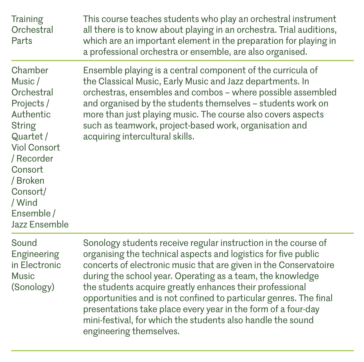 De Bachelor of Music in Sonologie biedt een unieke combinatie van cursussen die zowel de technische als de artistieke aspecten van elektroakoestische muziek en haar verschillende toepassingen omvatten. Daarnaast ontdekken studenten nieuwe leeromgevingen in de vernieuwde cursus "Educational Skills for Creative Artists" en ontwikkelen ze hun eigen unieke workshops en educatieve projecten. In het derde jaar lopen studenten een intensieve stage en doen ze ervaring op en leggen ze belangrijke contacten binnen de professionele gemeenschap. Stages worden aangeboden door bijvoorbeeld ARTEk, New Emergences, Soundtrackcity, Studio LOOS, V2_, WORM en Willem Twee.
