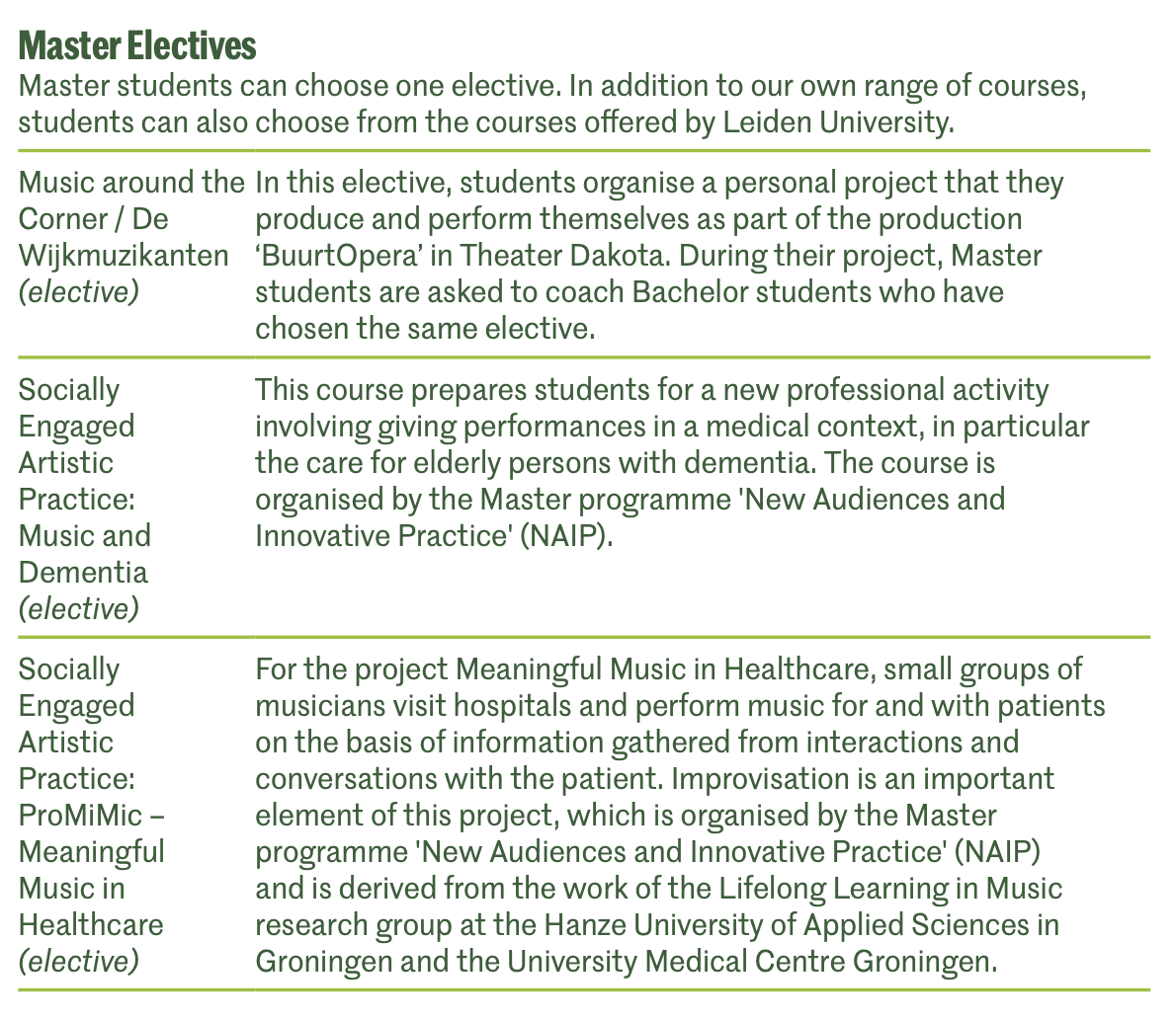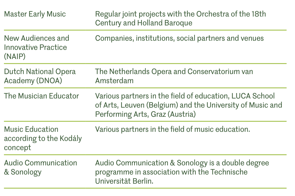We bieden een aantal unieke masteropleidingen aan die zijn ontworpen in overleg met professionele partners. In deze programma's worden onderwijs en praktijk met elkaar verweven om studenten een realistisch beeld te geven van het beroep en hen zo optimaal voor te bereiden op de realiteit van de beroepspraktijk. Dit proces leidt meestal tot het ontstaan van nieuwe ensembles en stelt onze studenten in staat een impuls te geven aan professionele partners.