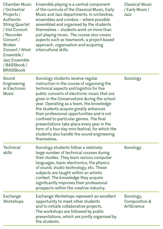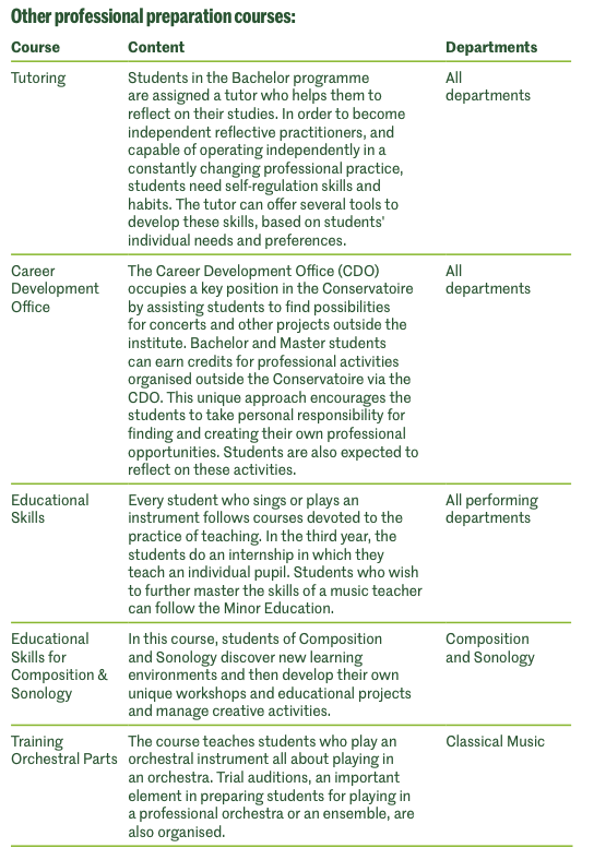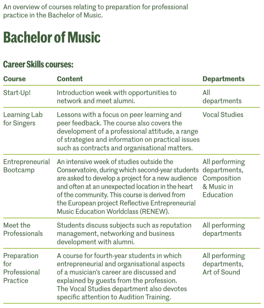 In de uitvoerende afdelingen is de ontwikkeling van professionele vaardigheden sinds 2020 vastgelegd in Career Skills-cursussen, waarin zowel 'zachte' als 'harde' vaardigheden aan bod komen. Deze vakken zijn zo in het curriculum opgenomen dat er een geïntegreerd en doorlopend leertraject ontstaat van jaar één tot en met jaar vier (B1-4). De Career skills-cursussen zijn Start-Up, Learning Lab for singers, Entrepreneurial Bootcamp, Meet the Professionals en Preparation for Professional Practice. Terugkerende onderwerpen zijn communicatie, zelfmanagement, artistieke identiteit en bewustwording van carrièremogelijkheden.