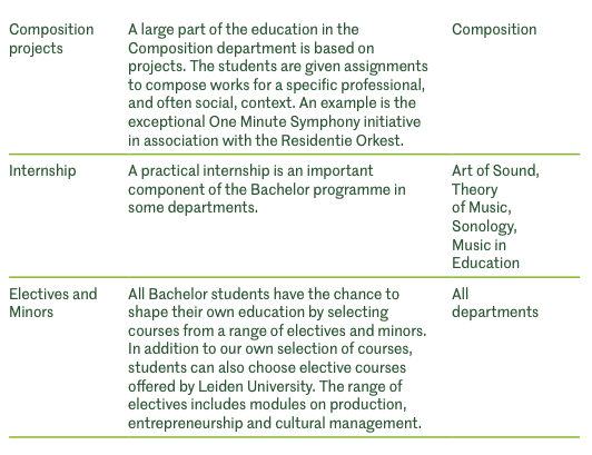 De commerciële aspecten van de beroepspraktijk worden belicht in het vak Production and Publishing for Composers. Dit vak heeft verschillende experts uit de beroepspraktijk als gastsprekers en biedt inzicht op het gebied van concertproductie, online productie, curatie, financiering, promotie en de wereld van publiceren. In Educational Skills for Composition & Sonology maken bachelorstudenten kennis met nieuwe leeromgevingen voordat ze hun eigen workshops en educatieve projecten ontwikkelen en creatieve activiteiten leiden. Studenten helpen actief mee met de organisatie van het Spring Festival, een jaarlijks evenement gewijd aan de nieuwste werken van de compositiestudenten, door musici te regelen en de productie, programmering en marketing voor hun rekening te nemen, waardoor dit jaarlijkse evenement een perfecte voorbereiding is op de beroepspraktijk.